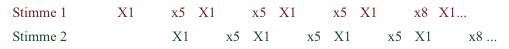 mehrstimmig | Zu zweit oder zu mehreren Frei: Diese Voyomo läßt sich leicht zu zweit oder zu mehreren ausführen. Man braucht keinen gemeinsamen Takt zu halten. Zuerst einigt man sich auf eine gemeinsame Tonlage, dann tönt jeder die Tonfolge in der zeitlichen Abfolge, die ihm gerade angenehm ist. Kanon: Ihr könnt auch einen zweistimmigen oder mehrstimmigen Kanon tönen. Eine Möglichkeit kannst Du hören unter voy_adv16-3_Kanon. Hier wird die Stimme 1 auf M getönt, Stimme 2 auf einem nasalen, offenen O (O wie in "fort"). Dieser Laut ist gut geeignet, dich beim Mitsingen der Stimme 2 zu führen, wobei Du selbst auf M tönst. Der Ton X1 wird jeweils doppelt so lange getönt wie x5 und auch x8. |