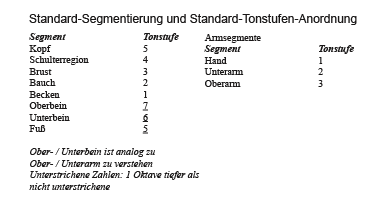 Wir teilen für die Arbeit mit Tönen den Körper in Segmente auf. Beim TONALEN VOYOM ordnen wir den Körpersegmenten Tonstufen einer Tonskala (Tonleiter) zu. Die wohl gängigste Skala im westeuropäischen Raum ist die Dur-Tonleiter. Mit 1 bezeichnen wir die Stufe 1 der Tonleiter (den Grundton), beispielsweise in C-Dur das c, wobei bei der Bezeichnung mit Zahlen die Oktavlage zunächst offen bleibt. Welcher Ton am besten als Grundton gewählt wird, wird weiter unten angegeben. In der folgenden Tabelle gibt die linke Spalte die Standard-Segmentierung des VOYOM an, die rechte Spalte zeigt, wie die Tonstufen bei der Standard-Anordnung auf die Körpersegmente gelegt werden. Siehe dazu auch unter TABELLEN |
