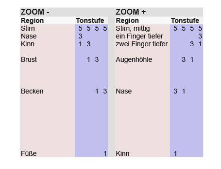Dieses voyomi zeigt die Technik des Zoomens. Dabei verwendest Du immer wieder dieselbe, kurze Tonfolge für verschieden weite Wege, bzw. verschieden große Regionen im Körper. Bei unserem Beispiel wird die Stirn als Fixpunkt eine besondere Rolle spielen. |